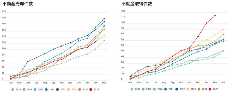 ※2025年度は2026年2月累計。 ※上場企業の開示資料において「固定資産」の譲渡/取得に関するリリース文書をもとに、ククレブ総合研究所にて集計。 ※出典の記載無き無断転載は禁じます。